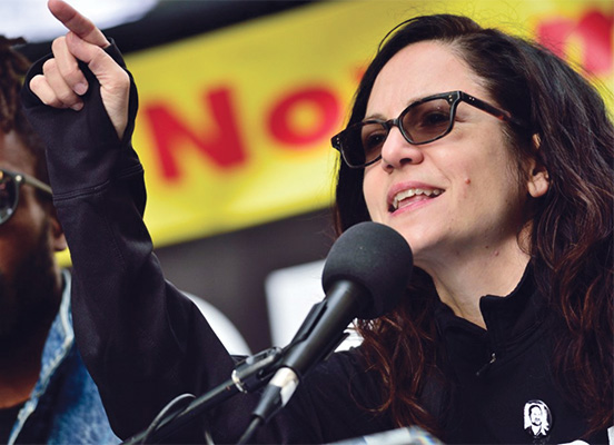 Sunsara Taylor, uma das MCs [mestres-de-cerimónias] do protesto na Cidade de Nova Iorque, co-iniciadora da Recusar o Fascismo e redatora do revcom.us