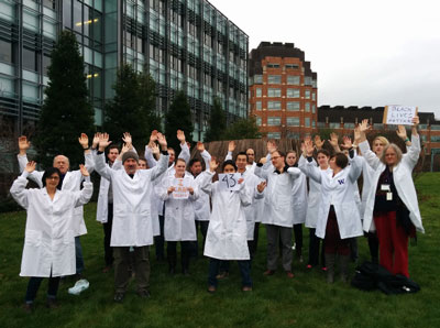 “Inspirados por isto, alguns de nós reunimo-nos e apelámos aos cientistas com quem trabalhamos na Universidade de Washington para usarem batas brancas, para trazerem cartazes com sentimentos, etc., e levantarmos as nossas mãos para dizer ‘Mãos Ao Ar, Não Disparem’, no que se tornou um gesto universal de que As Vidas dos Negros e Todas as Vidas São Importantes e de que esta brutalidade e assassinatos policiais têm que acabar. Vamos fazer uma foto disto para pôr no Twitter e propagar nos meios sociais para fazer com que seja amplamente conhecido que as pessoas que trabalham nas ciências também estão a tomar uma posição nesta questão. As pessoas que participaram querem fazer um evento maior em Janeiro quando as pessoas regressarem de férias e quando a mensagem pode ser divulgada de uma forma mais ampla.”