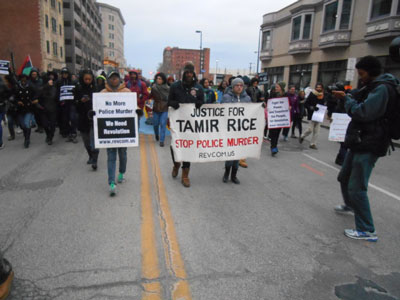 O protesto durou 10 horas, começando com uma concentração no parque onde Tamir foi abatido por ter uma arma de brincar, seguindo depois para a esquadra da polícia do Primeiro Distrito (a esquadra de onde era o polícia que matou Tamir), onde as pessoas deram os braços e bloquearam a rua durante quase uma hora a gritar “Tamir não tinha de morrer/Nós sabemos porquê/Todo o maldito sistema é culpado” e “fap, Foda-se a polícia”. Uma grande faixa que dizia “Nem Mais Um Assassinato Policial/Precisamos da Revolução!/revcom.us” estava presente. Dois homens avançaram com os seus camiões contra a multidão, gritando porcarias. Quando um dos camiões recuou, o homem puxou de uma arma.