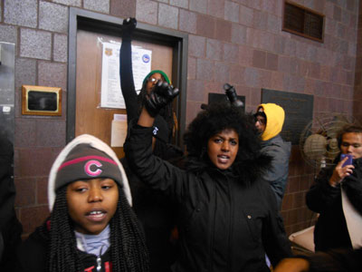Nate Hamilton liderou os gritos e uniu a multidão. Cerca de 50 cartazes que diziam “Ferguson É Em Todo o Lado! Acabar Com a Brutalidade e os Assassinatos Policiais. StopMassIncarceration.net” foram avidamente erguidos. Foram distribuído duzentos folhetos a convocar o “Rock no ano novo com a Resistência aos Assassinatos Policiais”.
