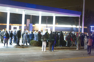 Os manifestantes regressaram ao posto de gasolina onde começaram confrontos entre os manifestantes e as linhas da polícia de choque. As autoridades mobilizaram a Polícia Municípal e a Patrulha Rodoviária do Missouri, bem como polícias de cidades vizinhas. Vários manifestantes foram presos e outros foram atacados com gás. Não houve só jovens, mas também pessoas mais velhas do bairro que saíram e ficaram no local. Um homem mais velho falou com orgulho sobre como os jovens que ele conhecia se tinham erguido correcta e militantemente perante a polícia na noite anterior.